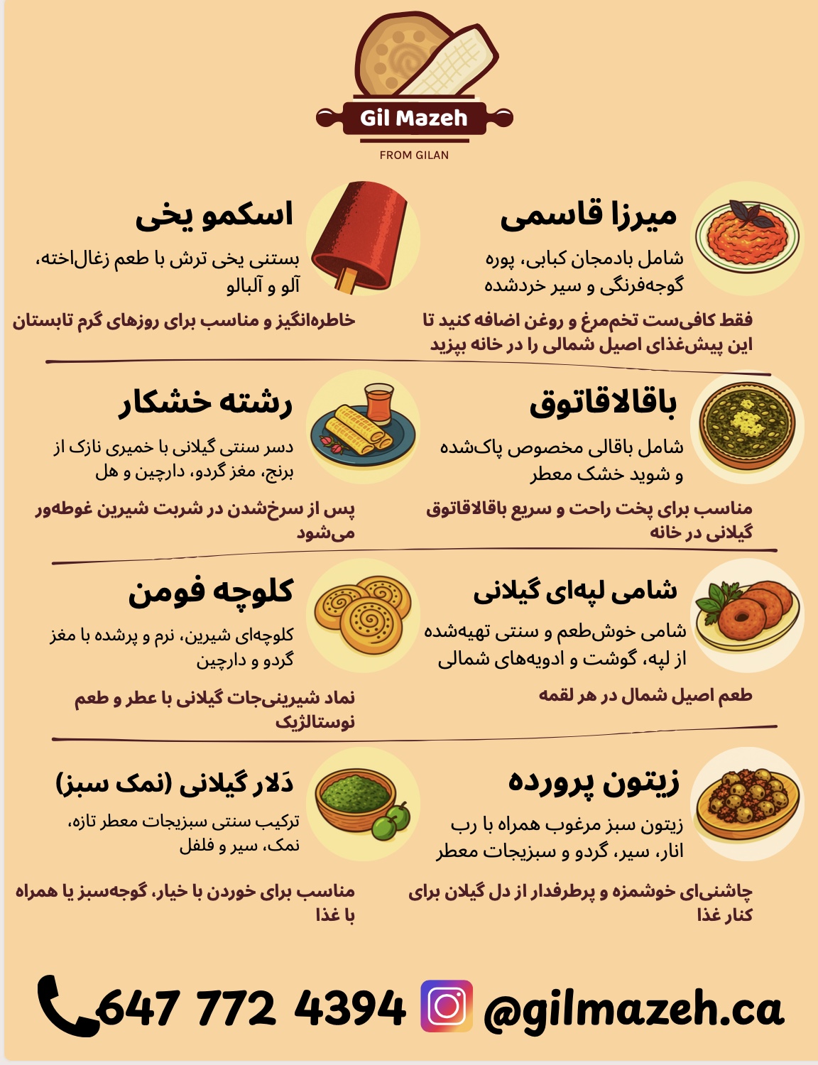 Gilans Local Delights: Our desserts, flavours, foods, and traditional sweets are crafted with love using fresh, high-quality ingredients sourced from Gilan. We incorporate local ingredients to create authentic and delicious treats that showcase the unique flavours and traditions of our region.